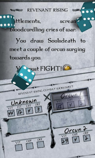 some dice rolling. The gamebook engine lets you throw 3D physics based dice that roll and bounce as if you were tossing them on a tabletop. Roll the dice to resolve combat by pitting your character against a myriad of enemies. Roll the dice to see if you were able to leap the gaping chasm, or pick the shopkeep’s pockets. Roll the dice to see if you won a bet, or caught the plague!