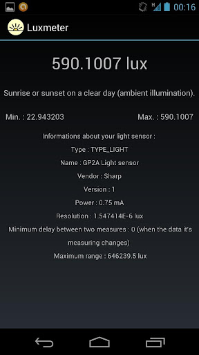 This application also displays informations about your ligth sensor (resolution, maximum range, constructor, etc…).