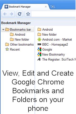 Overview: The ONLY Android app to give you native access to all your Google Chrome Bookmarks. Bookmarks and Folders are synced to this app on your phone and then kept in sync with your browser(s). Choose to automatically sync or manually sync.